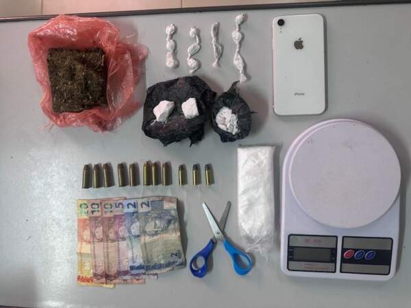 Também foram encontradas munições de calibres .38 e .32, segundo relato do suspeito, a arma de fogo não estava mais em sua posse, ao todo, foram apreendidos 11 petecas de cocaína, duas pedras maiores da mesma substância, uma porção adicional da droga, um pedaço de maconha prensada, oito munições calibre .38, três munições calibre .32, R$ 49 em espécie, um aparelho celular, além de embalagens e utensílios utilizados para o acondicionamento dos entorpecentes.