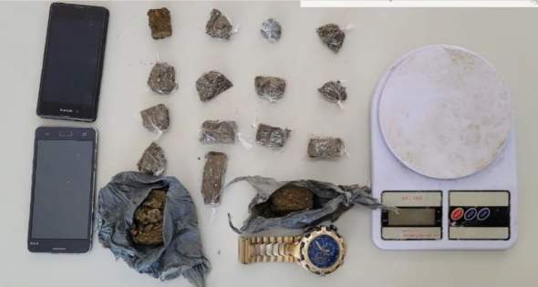 Ao abordar a dupla, a polícia identificou que com eles havia 16 porções de maconha, prontas para venda; 02 porções a granel da mesma substância; 01 balança de precisão; 02 aparelhos celulares; e 01 relógio.
