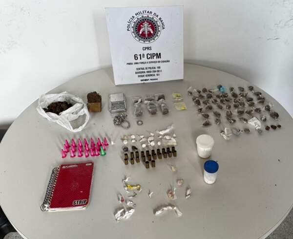 Foram apreendidos 22 pinos de cocaína; 17 saquinhos de cocaína; 21 pedras de crack; 02 potes com pó, similar a cocaína pesando 73 gramas; 53 buchas de maconha; 12 porções de maconha; 20 munições de calibre .9mm, munições de calibre .40, LSD, balança de precisão além de caderno de anotação do tráfico. O material apreendido foi apresentado na Delegacia Territorial de Ubaitaba. (Ubatã Notícias)