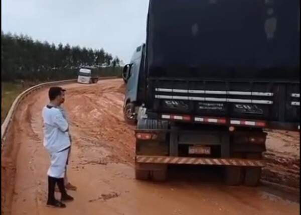 Mais adiante, na estrada de terra completamente coberta por uma espessa camada de barro vermelho, diversas carretas e caminhões estão parados, presos na lama, aguardando socorro, tornando a via quase intransitável para qualquer tipo de veículo.