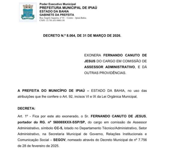 A Prefeitura de Ipiaú oficializou, nesta terça-feira (31), a exoneração do assessor administrativo Fernando Canuto de Jesus, conhecido como “Fernando Canuth”, após o avanço das investigações que o colocam como alvo de uma operação policial no município.
