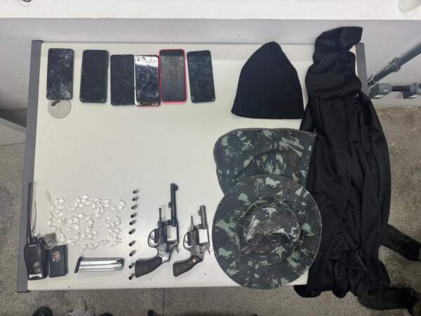 Com a dupla, a polícia apreendeu 01 (um) revólver cal.38, marca Rossi, com numeração 733N; 07( sete) munições deflagradas; 02(duas) munições picotadas; 01(um) cartucho intacto; 01(um) revólver calibre.38 com numeração 21072; 01(uma) bucha de substância análoga à maconha; 59(cinquenta e nove) porções de substância análoga à cocaína; 07(sete) aparelhos celulares; 01 (um) HT; 01 (um) carregador de HT; 01 (um) carregador de pistola 380 e 02 (duas) mochilas.