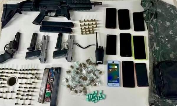 Entre os itens apreendidos no local estavam uma metralhadora 3D, uma espingarda calibre 12, uma espingarda artesanal, 174 munições de calibres variados, uma calça camuflada, uma touca ninja, 1,13 kg de maconha, 157 gramas de crack, 92 pinos de cocaína, cadernetas com anotações do tráfico, duas motos e R$ 6.700 em espécie.
