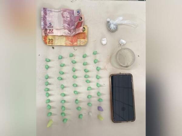 Ao chegar ao local, os policiais avistaram um dos suspeitos, e assim procederam com a abordagem. Durante a revista, foram encontrados com ele 48 pinos e duas buchas de uma substância análoga à cocaína, além de uma porção de material semelhante à maconha, R$ 35,00 (trinta e cinco reais) em espécie e um aparelho celular.
