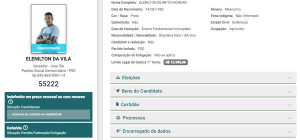 O Ex-candidato a vice-prefeito em 2020 e agora pretenso candidato a vereador pelo município de Una Elenilton de Brito Moreira “Elenilton da Vila” (PSD) teve a sua candidatura considerada não regular e seu pedido de registro foi julgado indeferido pela justiça eleitoral.