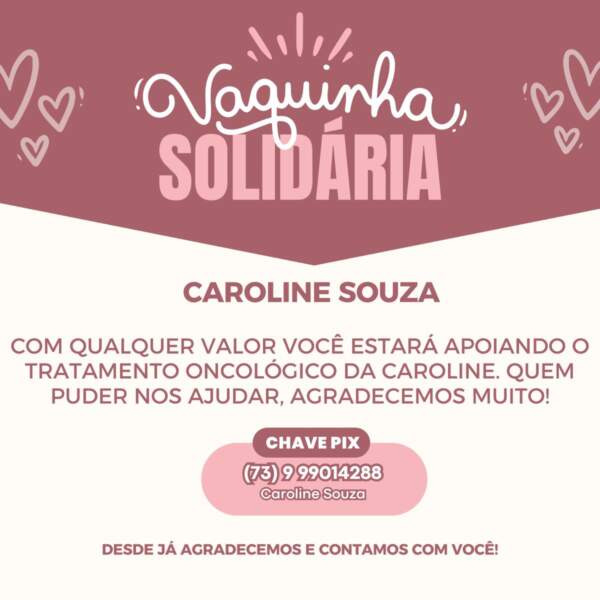 A campanha aceita qualquer quantia, pois toda doação é um passo importante para garantir que Caroline continue recebendo o tratamento adequado. As contribuições podem ser feitas via chave Pix Celular: 73 999014288 (Caroline Souza Santos).