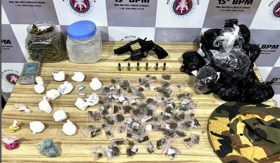 Após denúncia anônima, os policiais realizaram a verificação e encontraram nas proximidades do rio cachoeira os materiais ilícitos que estavam armazenados em vasos plásticos. Foram apreendidos um revólver cal.38, seis munições cal. 38, 400 g de cocaína, 300g de maconha, 122 porções de haxixe, uma balança de precisão e um chapéu camuflado.