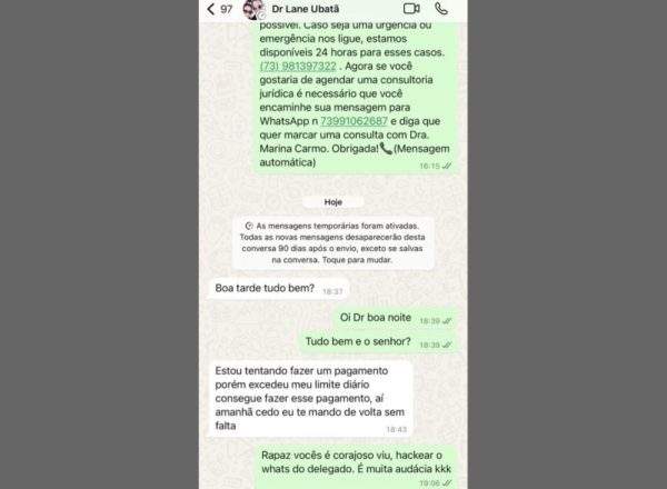 A vítima, no entanto, percebeu o golpe e respondeu com ironia: “Rapaz, vocês são corajosos, hackearam o WhatsApp do delegado! Muita audácia!” As autoridades alertam que esse tipo de golpe é comum e recomenda que as pessoas não realizem transações financeiras sem antes confirmar a identidade do contato, preferencialmente por ligação telefônica. *Com informações do Ubatã Notícias